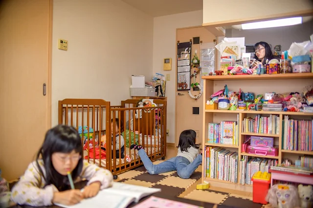朝ごはんが終わると、二人の姉は学習教材を広げて勉強を始める。一歳の末っ子が「おかあさんといっしょ」を見始めると、手が止まり、視線はテレビに。