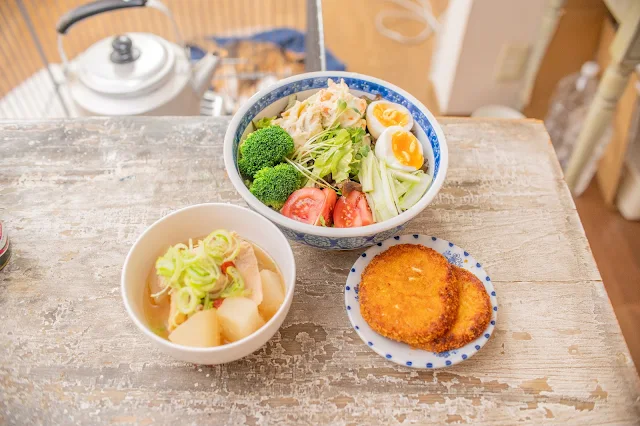 今夜のおさんどん。 鳥大根煮 野菜フライ 大盛りサラダ